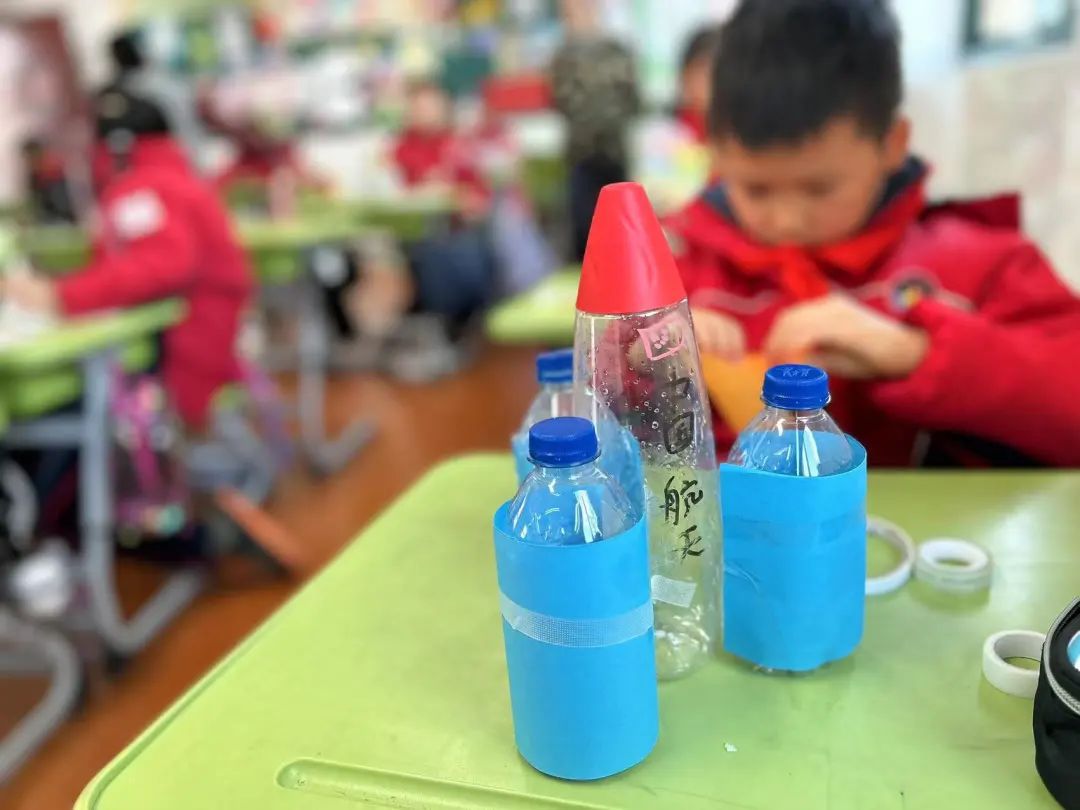 四年级学生丁妤宁向记者展现了自己的著作:“这个瓶盖就像火箭头,我用纸画了一个五星红旗画在上面,然后再把快递的纸板剪下来之后涂上色彩拼接成火箭的‘翅膀’”。