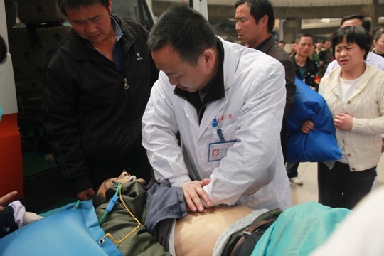 4月16日,从灾区送来一名危殆患者。抬下救护车时已然显现心跳骤停,状况非常紧迫。我第一时间冲上前去,马上为患者进行现场心脏按压,经过不懈尽力,总算将患者从死神手里抢了回来。我也长长的舒了一口气。灾区患者什么突发状况都有可能发生,我必定要时间预备着打赢这场仗。